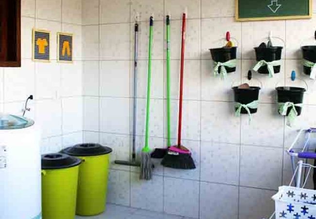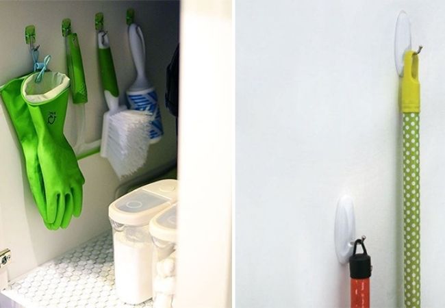4. Até dentro do armarinho da lavanderia os ganchos são úteis para pendurar os utensílios menores e otimizar o espaço