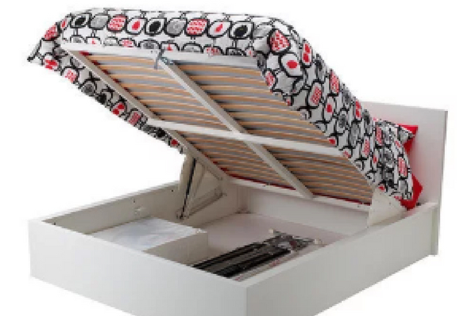 Também tem os modelos de camas com gavetas nas laterais, que cumprem uma função parecida. O ponto negativo é que não cabe tanta coisa nas gavetas do que se você erguesse o colchão e tivesse um espaço aberto para armazenamento. Porém, o benefício é não precisar levantar a tampa desse grande baú sempre que precisar pegar alguma coisa ali dentro.
