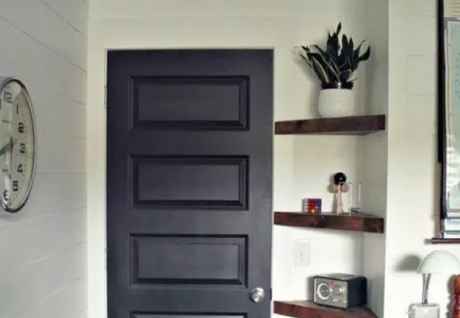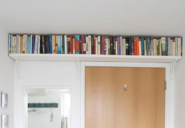As prateleiras são uma excelente solução pra organizar apartamentos pequenos. Pelo fato de ficarem suspensas, ocupam muito menos espaço. Nesse exemplo da imagem a ideia foi de aproveitar um espaço de parede próximo ao teto, que não teria outro uso.