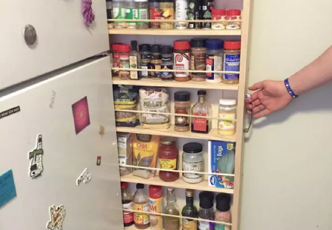 Veja nesse exemplo acima a ideia de criar uma gaveta verticalizada para servir como despensa e aproveitar um espaço de forma muito inteligente.