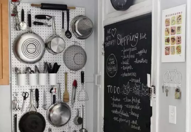 Os painéis perfurados são muito utilizados em garagens e oficinas para organizar ferramentas. Mas também são ótimos aliados para organizar apartamentos pequenos. Você pode comprar painéis prontos e apenas mandar cortar na medida que vai precisar. Depois pode pintar para combinar com a decoração e instalar com aparafusadeira.