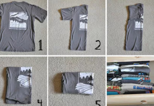 Uma forma útil de dobrar as camisas e outras peças de tecidos leves é fazendo rolinhos. A roupa vai ocupar muito menos espaço. A dica só não funciona com peças jeans ou muito grandes, pois o rolinho fica grosso e acaba ocupando mais espaço do que se dobrar normalmente.