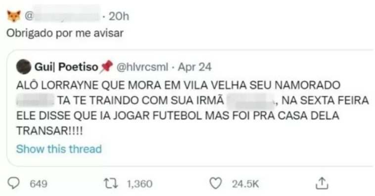 Foi isso que aconteceu com Lorrayne Gonçalves, de Vila Velha, no Espírito Santo. Por meio de uma mobilização coletiva no Twitter, chegou até ela um tuíte contando que seu namorado a estava traindo com sua amiga de infância.