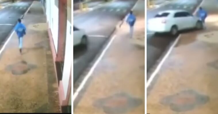 As câmeras de segurança da rua registraram o momento em que um homem de jaqueta azul aparece correndo na calçada. Em seguida, um carro branco surge, sobe na calçada e atropela o suspeito.