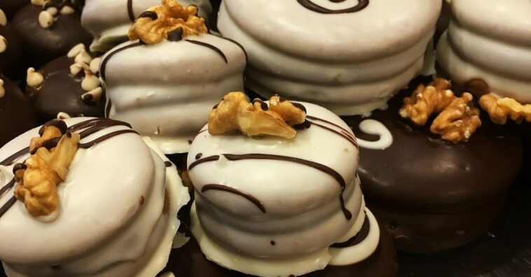 - Recheio: corte o bolinho no meio e passe chocolate 80% cacau derretido ou pasta de amendoim, finalize mergulhando os bolinhos no chocolate.