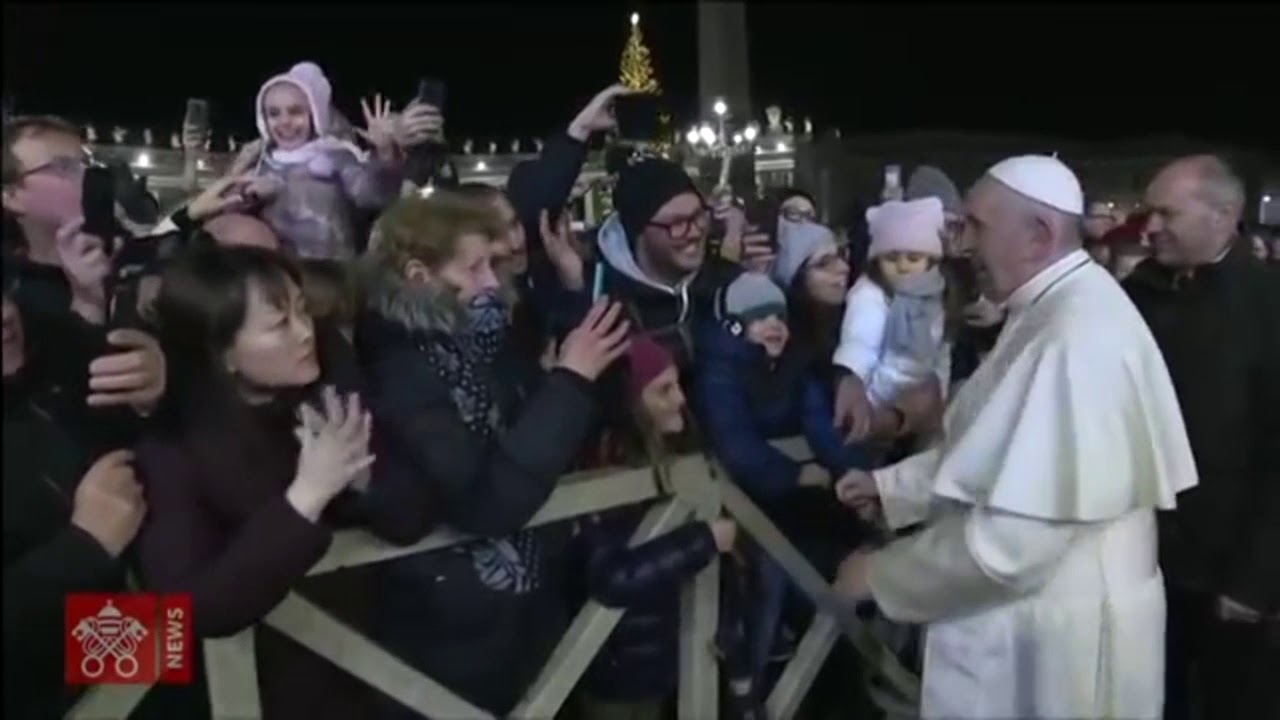 O Vaticano estava lindo, todo decorado para o Natal, como é de costume todos os anos. Uma multidão aguardava o santo padre na Praça de São Pedro, tendo apenas uma divisória móvel para separar o pontífice dos fieis. Como faz todos os anos, ele foi caminhando pela borda e cumprimentando todo mundo.