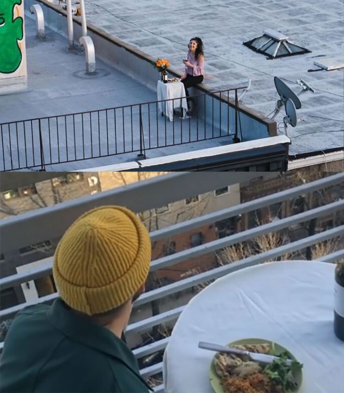 O mais comum que se faz quando quer encontrar alguém para conhecer melhor. Eles marcaram um jantar. Mas, como não poderiam se encontrar pessoalmente por causa da quarentena, ela jantou no terraço e ele na sacada.
