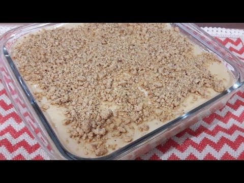 Essa é uma versão clássica de pavê com bolacha maisena e creme de leite condensado com amendoim moído.