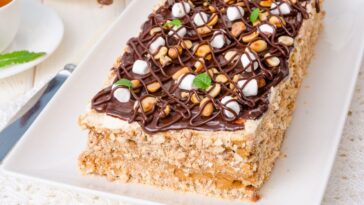 Feito com farofa de bolacha Maizena, fica maravilhoso, contrastando com a textura das nozes, do creme e da cobertura. Para isso, precisa de doce de leite, creme de leite, nozes, chocolate meio amargo, leite, chocolate em pó e biscoito Maizena.