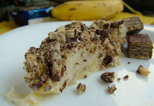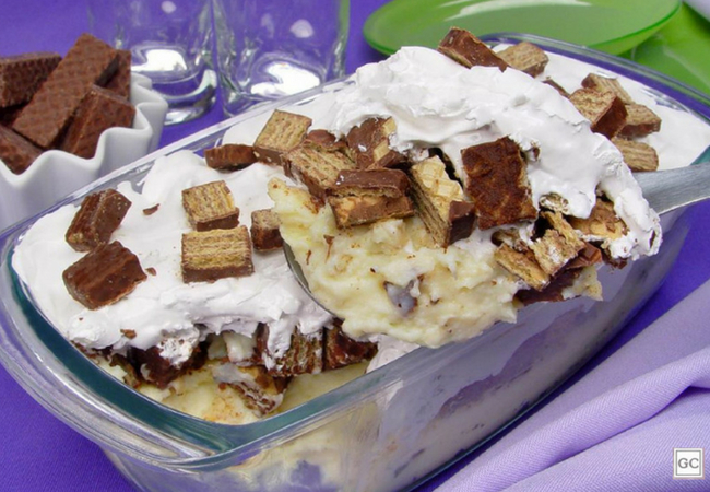 A banana é outra fruta que incrementa qualquer sobremesa, aliás, até pratos salgados. Nessa opção você só vai precisar de bananas, limão, açúcar, creme de leite e Bis. Fica cremoso, não fica enjoativo e vale a pena experimentar.