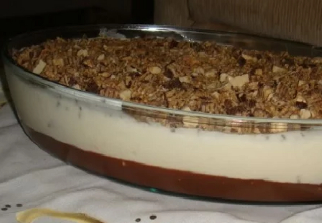 Essa é uma opção para quem gosta de misturar o azedinho da mousse de maracujá com o doce do Bis e dos outros ingredientes do creme. Então é uma das opções menos enjoativas. Essa sobremesa é feita com suco de maracujá fresco ou concentrado, creme de leite, leite condensado, gelatina de maracujá, água fervente e Bis.