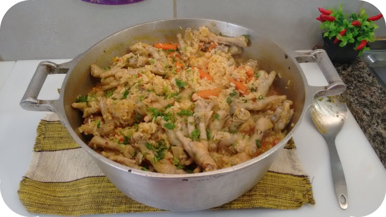 Se quiser fazer um prato com arroz, essa é a receita ideal. Esse é um bom prato principal para almoço. Vai precisar de pés de frango, arroz, cenoura baby, tomate, cebola, cheiro-verde, pimenta de cheiro, sal, caldo de galinha, polpa de alho, óleo, colorau e água. Veja como fazer: