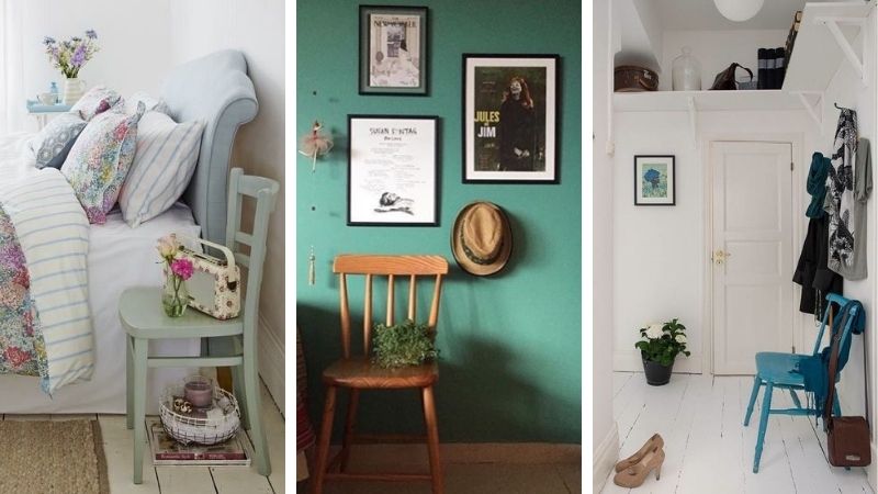 Podem ser cadeiras ou banquinhos de madeira, de metal, plástico ou acrílico. Não precisam ser um conjunto de peças iguais e nem ter estofado. Isso porque essas cadeiras e bancos podem servir não apenas para se sentar na mesa, mas sim, como mesinha de cabeceira, como apoio para plantas, cabideiro no hall de entrada e até para usos diversos no banheiro.