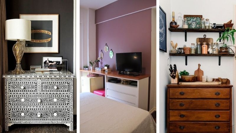 Outra peça ótima para ter espaço de armazenamento, servir como apoio e decorar é a cômoda. Esse é um móvel maior, porém não tão grande quanto um guarda-roupas. A cômoda pode ficar no quarto, na sala, na cozinha, no hall e também no banheiro. Quando for comprar, escolha um modelo mais neutro e um tamanho médio que caiba em diferentes espaços com facilidade.