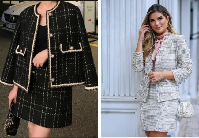 Esse tecido é uma lã áspera muito usada em conjuntinhos, casaquinhos e blazer feminino ou masculino. Só o blazer, curtinho e com um corte legal combinando com jeans, ou só a saia curta com uma camisetinha, não vai envelhecer. O problema é usar o conjuntinho de calça ou saia longuete e casaquinho, pois é outro look bastante escolhido pelas senhoras de idade.