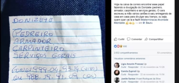A publicação foi compartilhada por mais de 2.500 pessoas, uma delas, a designer Erica Gois. Estava claro para ela que um homem tão perseverante merecia um apoio para divulgar ainda mais seus serviços. Erica criou e mandou imprimir mil cartões de visita para Donizete, além de um banner para ele colocar nas obras que estiver fazendo.