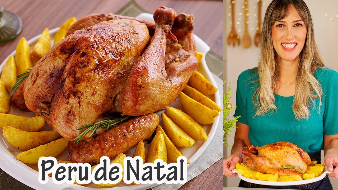 Veja como temperar e preparar o peru e as batatas no passo a passo do vídeo: