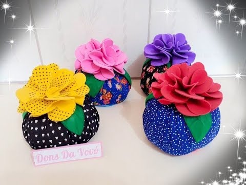 Esse também é um modelo do formato de vasinho de flor. No interior ele tem um saquinho cheio de areia e por fora é revestido com tecido da sua escolha. As flores são feitas de EVA que é um material muito fácil de trabalhar. Os moldes estão na descrição do vídeo.