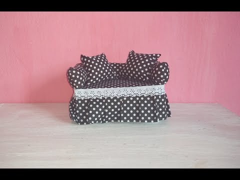 E que tal colocar um mini sofá para segurar a sua porta da sala aberta? Essa ideia fofa é feita com caixa de leite, que fica no tamanho exato do sofá. Também vai usar tecido, tampinhas de garrafa PET, cola quente, bico de renda, linha e agulha.