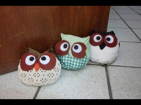 Essas lindas corujinhas redondinhas esperando você na porta ficam tão encantadoras quanto o modelo de cachorrinho. Para fazer, vai precisar de feltro e tecido. Esse modelo você pode fazer para encher com material pesado e deixar na porta ou também pode encher com espuma e transformar em um brinquedo fofinho.