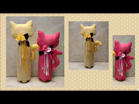 Para os amantes de gatos, esse modelo com base de garrafa PET é lindo. Você pode fazer dois ou três em tamanhos diferentes para formarem um conjunto e deixarem a decoração dos cômodos mais bonita. A garrafa PET pode ser preenchida com pedrinhas ou areia. O revestimento é feito em tecido.
