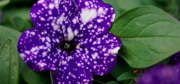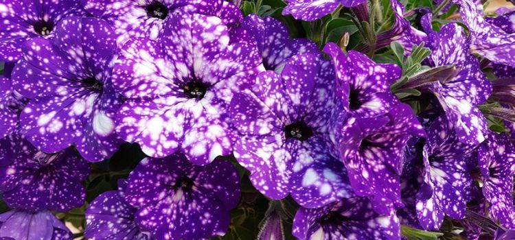 Elas são flores roxas, de pétalas grudadas umas nas outras e cheias de manchinhas brancas que se parecem com estrelas aglomeradas de uma galáxia. Esse tipo de petúnia é um híbrido, lançado em 2018, quando foi internacionalmente premiada com flor destaque em design e inovação.