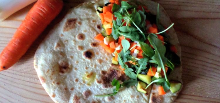 - Quando os envoltórios estiverem prontos, coloque todos os legumes na piadina, adicione uma garoa de óleo, se quiser, e uma pimenta picada.