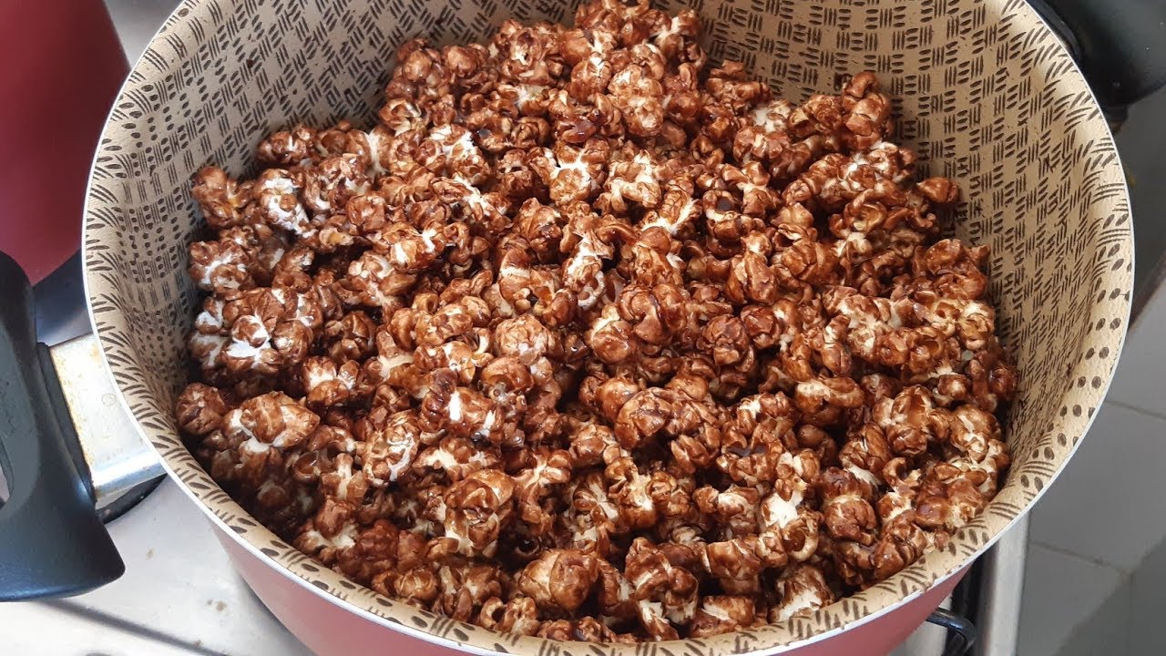 Se você gostou das duas receitas anteriores, mas quer adaptar para uma coisa mais simples e prática, faça esta versão. A calda não leva água, apenas Nescau, açúcar e manteiga. O milho da pipoca é misturado com a calda na panela e ferve junto para estourar já na calda de chocolate. Nem precisa ficar misturando depois.