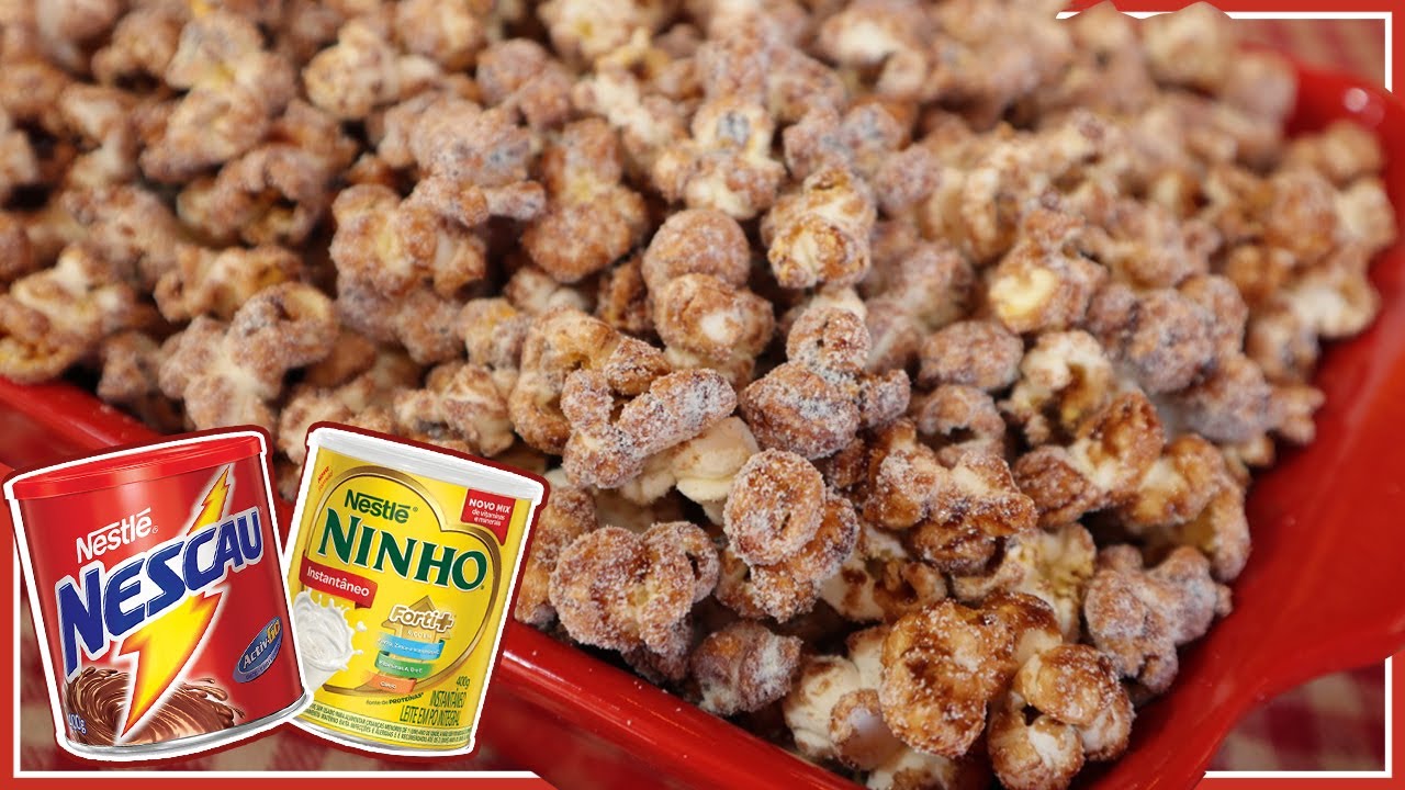 Além da versão com calda de Nescau, você também gostaria de provar uma pipoca com gostinho de leite Ninho? Então é só misturar todos os ingredientes e fazer uma pipoca de choconinho. Essa receita leva açúcar, Nescau, leite Ninho e água. Nessa opção o milho vai estourar dentro da calda e ficar tudo misturado de uma só vez.