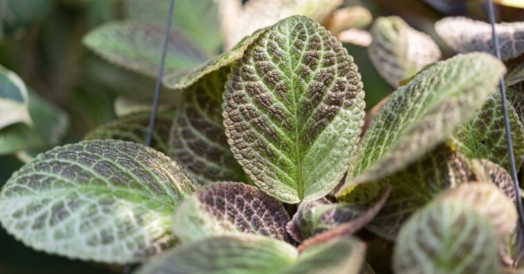 Suas folhas chamam a atenção porque têm pelinhos, são arredondadas com as bordas denteadas. Já a cor e o tamanho das folhas vão depender da variedade, podendo ser verde com acobreado, prateado, avermelhado ou roxo. São todas lindas.