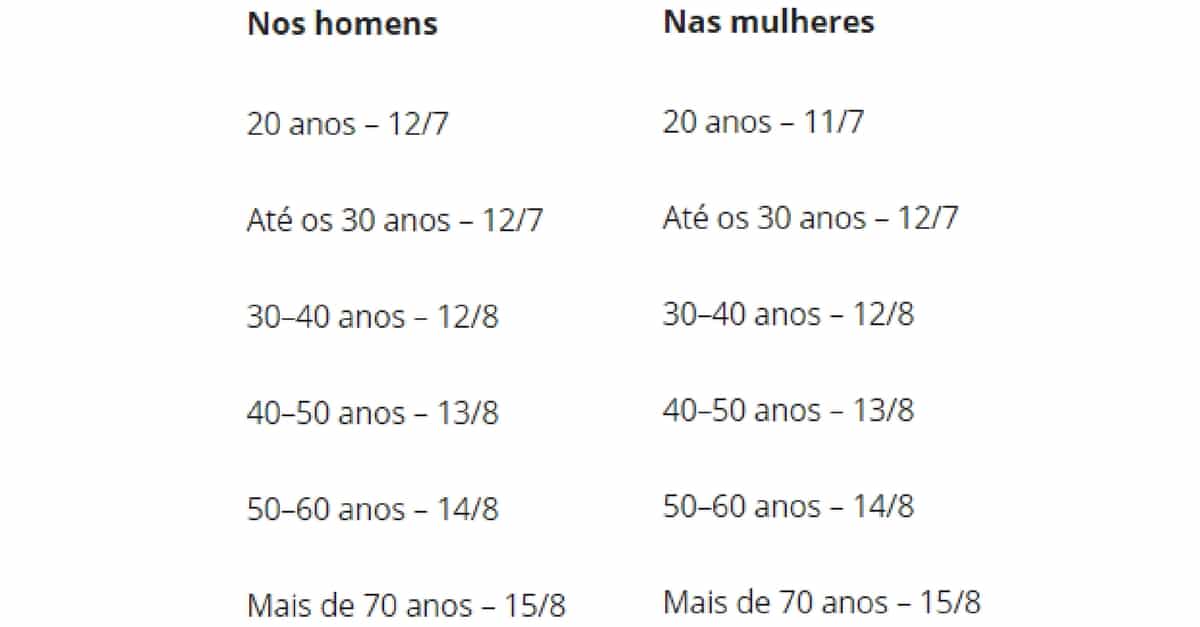 Existe uma tabela com os valores normais de pressão de acordo com a idade e o sexo, mas lembre-se que cada caso é um caso, e o diagnóstico deve ser dado pelo médico.