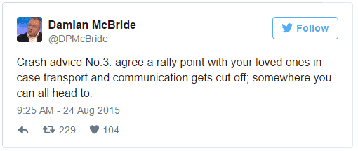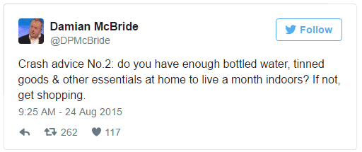 Em três polêmicos twittes, pedia à população para que estocassem água e enlatados, pois uma grande crise se aproximava.