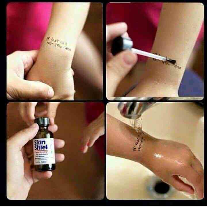 A técnica ensinada pela polícia resiste até a chuva! Basta escrever seu telefone no pulso da criança e passar uma boa camada de antisséptico Band-Aid líquido.