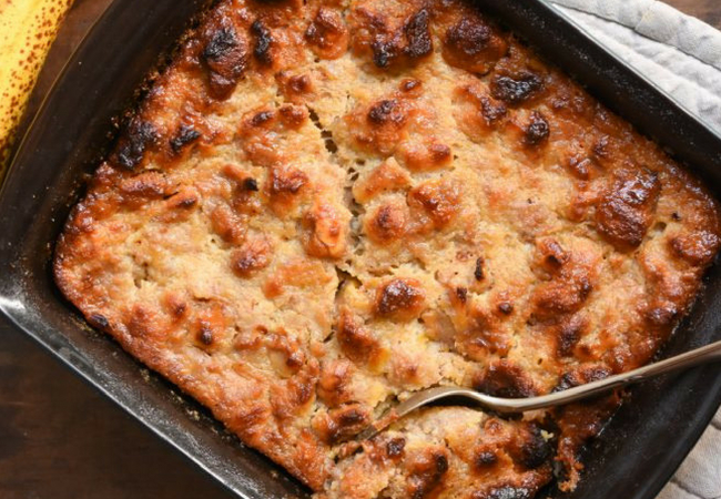 Seja para servir quente, acompanhado de uma bola de sorvete, ou então bem gelado, esse pudim fica surpreendente. Por ser vegano é feito com leite vegetal e nada de ovos. Apenas canela, suco de limão, trigo, bananas e açúcar mascavo. A aveia entra na cobertura, que fica como uma granola crocante. Veja a receita do Veganana: