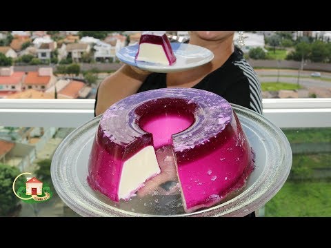 Outra forma de preparar essa sobremesa e deixá-la muito apetitosa é tomando cuidado com a apresentação do prato. Nessa versão, o pudim fica desenhado por dentro da camada exterior de gelatina, e dá até pena de comer porque fica bem bonito. Para o pudim você vai usar leite condensado, leite, gelatina incolor e creme de leite. Depois vai fazer uma gelatina para cobrir, do sabor que desejar, como no vídeo que mostra uma opção de uva:
