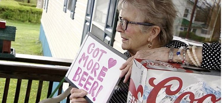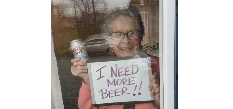 A senhora em questão é Olive Veronesi, de 93 anos e moradora de Seminole, na Pensilvânia (EUA). Sozinha em casa, ela fez uma placa escrito “Eu preciso de mais cerveja!!” e foi para a janela com um belo sorriso no rosto e uma latinha da marca Coors Light na mão.