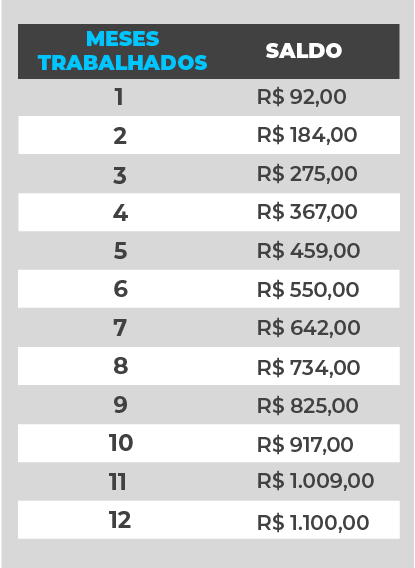 Para saber o valor exato a receber, divida o valor do salário mínimo atual (R$ 1.100) por 12 e multiplique pelo número de meses que você trabalhou com registro. Para facilitar, veja os valores calculados na tabela abaixo: