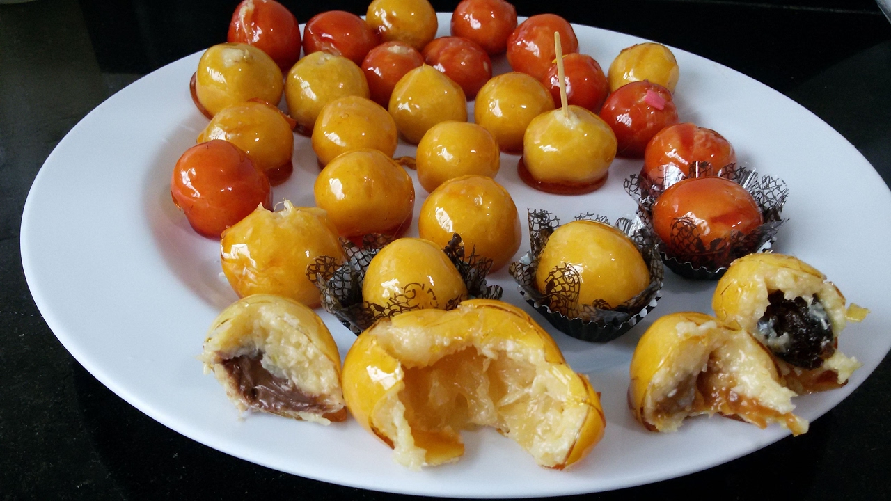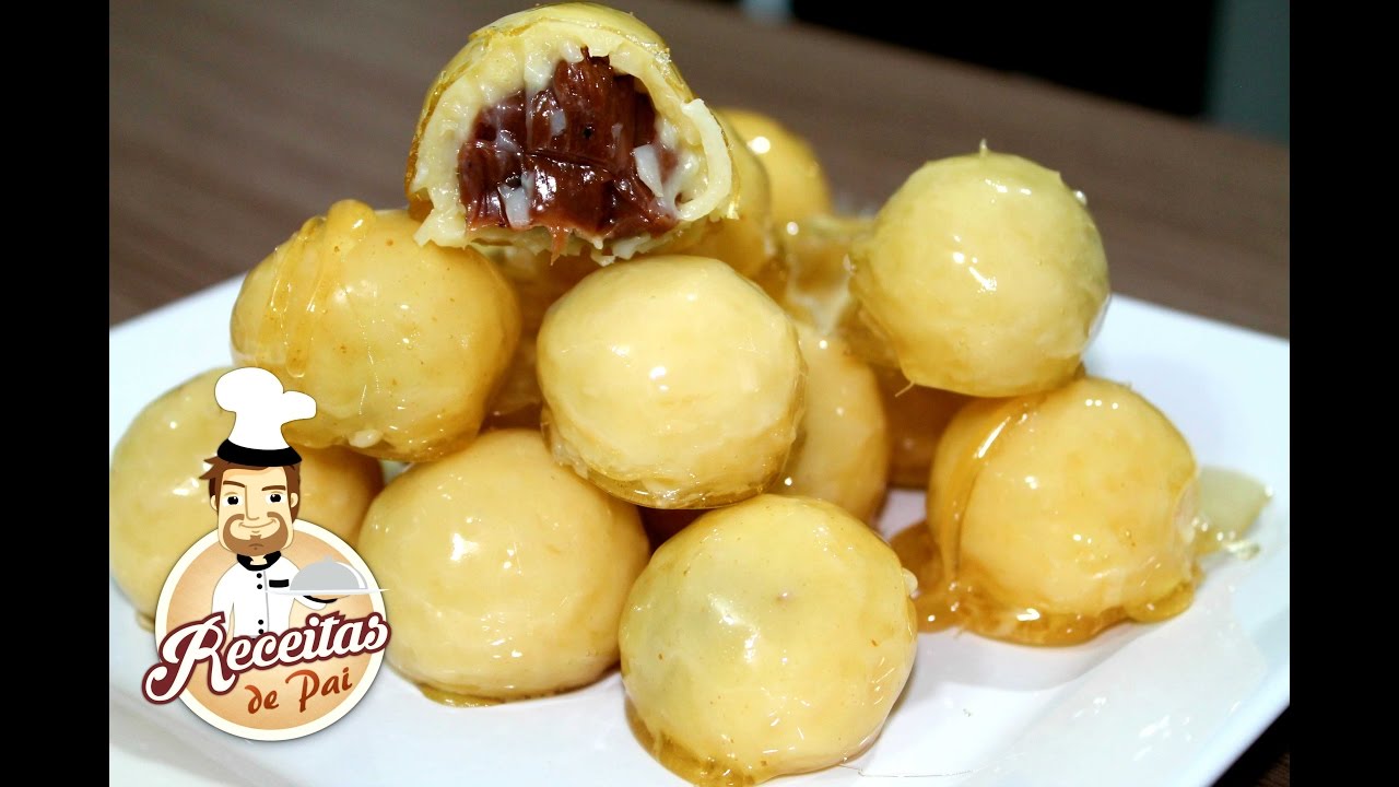 Essa é uma massa feita com leite condensado, gema, manteiga e coco ralado. A calda é a mesma das demais receitas e as sugestões de recheio que dão certo são Nutella, abacaxi em calda escorrido e picado, doce de leite bem cremoso mais durinho e pedacinhos de ameixa seca em calda. É bom ter variedade, então faça um pouco de cada, com certeza ninguém vai reclamar de ter que provar todas: