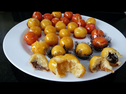 Essa é uma massa feita com leite condensado, gema, manteiga e coco ralado. A calda é a mesma das demais receitas e as sugestões de recheio que dão certo são Nutella, abacaxi em calda escorrido e picado, doce de leite bem cremoso mais durinho e pedacinhos de ameixa seca em calda. É bom ter variedade, então faça um pouco de cada, com certeza ninguém vai reclamar de ter que provar todas: