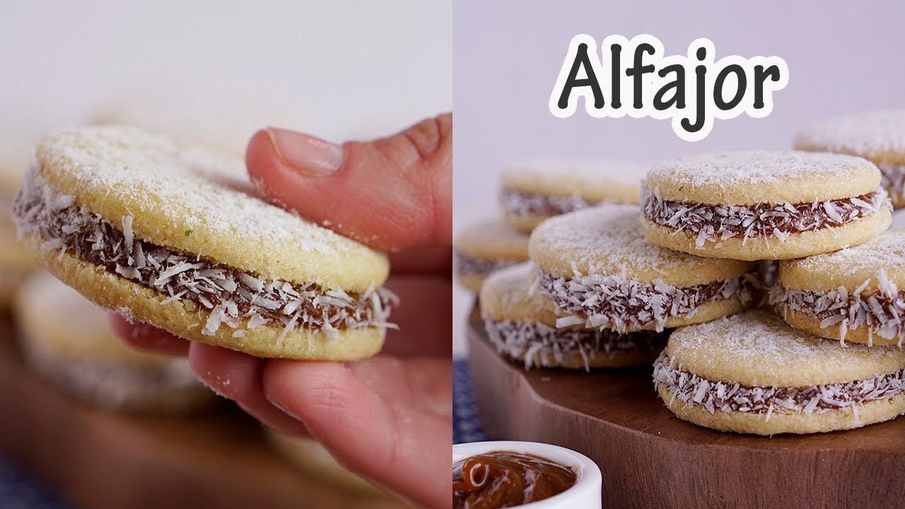 Se não quiser passar o trabalho de fazer uma cobertura de chocolate derretido, não precisa. Seus alfajores vão ficar igualmente maravilhosos com coco ralado em volta. Essa versão é feita com uma massa mais fininha à base de trigo, amido, sal, fermento, bicarbonato, manteiga, açúcar, gemas, baunilha e raspas de limão. Veja como fazer a montagem: