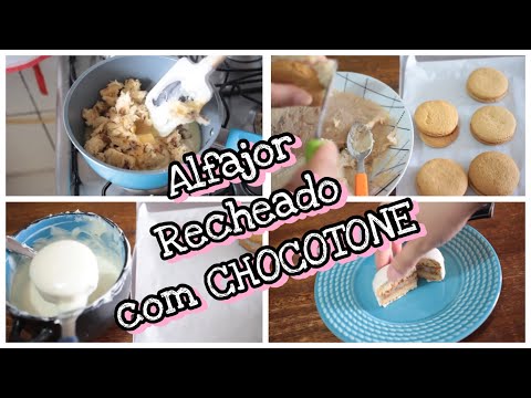 Se não quiser passar o trabalho de fazer uma cobertura de chocolate derretido, não precisa. Seus alfajores vão ficar igualmente maravilhosos com coco ralado em volta. Essa versão é feita com uma massa mais fininha à base de trigo, amido, sal, fermento, bicarbonato, manteiga, açúcar, gemas, baunilha e raspas de limão. Veja como fazer a montagem: