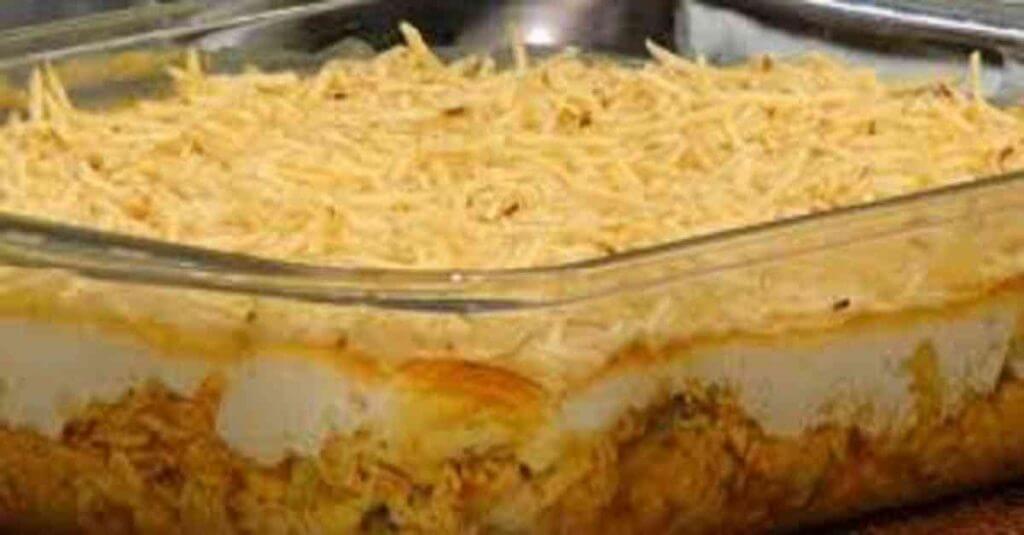 - Em uma travessa grande de vidro (redonda ou quadrada), faça uma camada com o preparado de frango.
