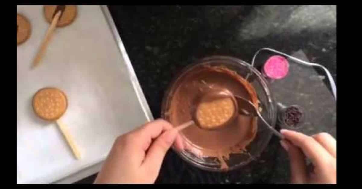 2. Passe o palito de picolé na massa de chocolate, encaixe no centro da bolacha e reserve;