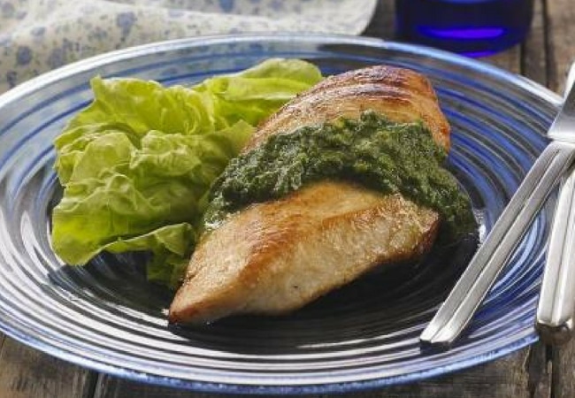 - Coloque o molho em uma travessa, fatie os peitos de frango e arrume na travessa com o molho. Enfeite com ervas.