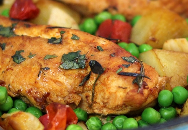 - Adicione um pouco de óleo numa assadeira eleve o peito de frango ao forno a 180ºC por cerca de 40 minutos.
