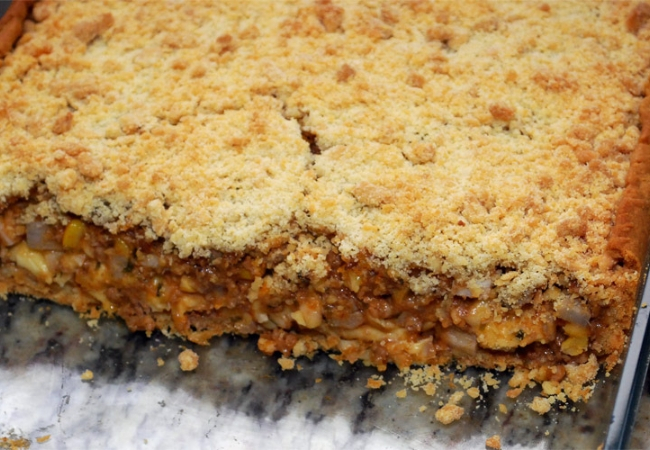 Carne moída com palmito também é mais uma combinação que dá certo e fica deliciosa entre as opções de receitas de empadão. Essa sugestão é diferente porque a parte de cima é uma farofa. A sugestão é do Crônicas Culinárias.