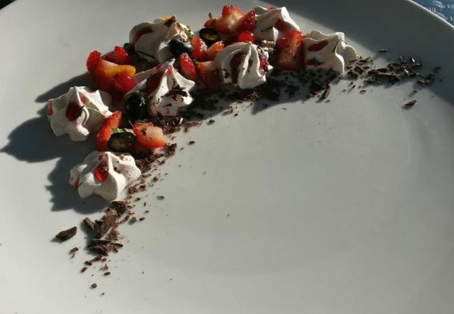 Compre uma mistura de frutos vermelhos com morangos, amoras, mirtilos, framboesas e outras que gostar. Depois faça um merengue simples com açúcar e claras, leve ao forno para assar e sirva coberto com os frutos geladinhos, doce de frutos vermelhos e raspas de chocolate.