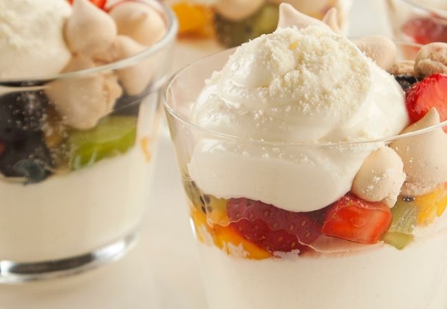 Essa é uma sobremesa bem diferente da anterior. Você faz o merengue batendo o creme de leite com o açúcar, depois intercala em tacinhas com manga picada de suspiro pronto ou caseiro picado. Fica uma sobremesa refrescante e deliciosa.