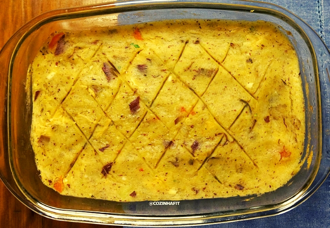 - Transfira a massa para forma e leve para assar em forno aquecido a 180ºC por aproximadamente 30 minutos. Faça o teste do palito, quando sair limpo está pronto.