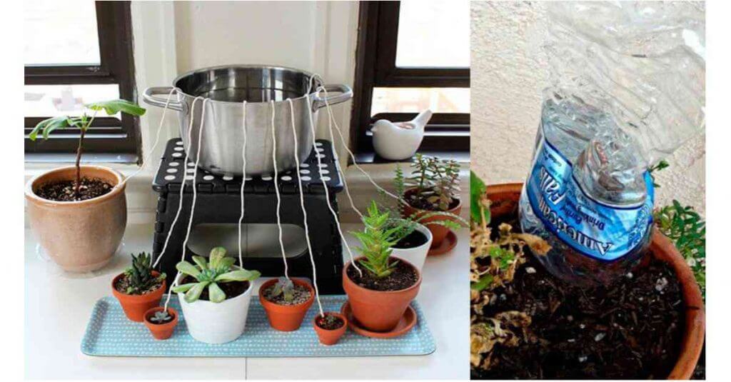 Você pode pegar um recipiente grande (como uma panela por exemplo) e encher de água. Coloque-a próximo à suas plantas mas em um lugar mais elevado, como em cima de uma cadeira. Depois, pegue fios de barbante e coloque dentro da panela e, com ajuda de uma chave de fenda, finque a outra ponta do barbante dentro do vaso de planta, prendendo na terra. A água irá passar pela capilaridade do barbante e descer até as suas plantas. É por isso que a panela de água deve estar acima das plantas, para ter uma ajudinha da gravidade na hora de regar as plantas. Prenda a ponta do barbante que está dentro da água com algum objeto pesado no fundo.